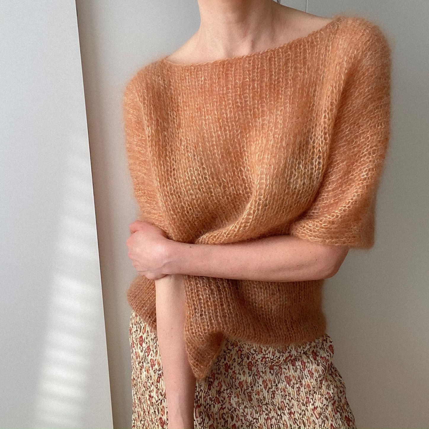The short-sleeved mohair shirt with dropped shoulders is worked seamlessly in one piece from the top down. The stitches for the shoulders and sleeves are started using a provisional cast-on, while the stitches for the neckline are cast on in one piece using the long-tail cast-on and then joined in the round. An illustrated step-by-step guide can be found in the appendix.