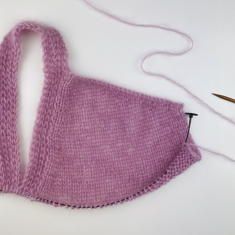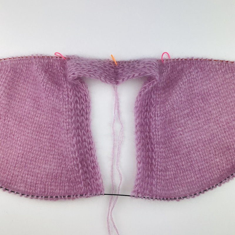// Picture 5/7 Pick up stitches: … at the transition from right neckband’s long side to right front piece, work a left leaning increase …