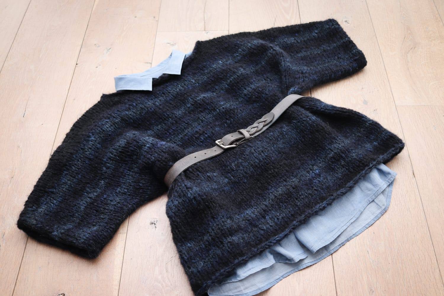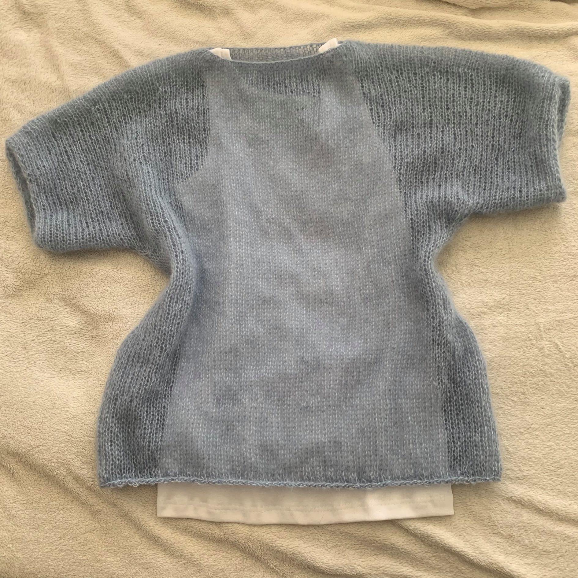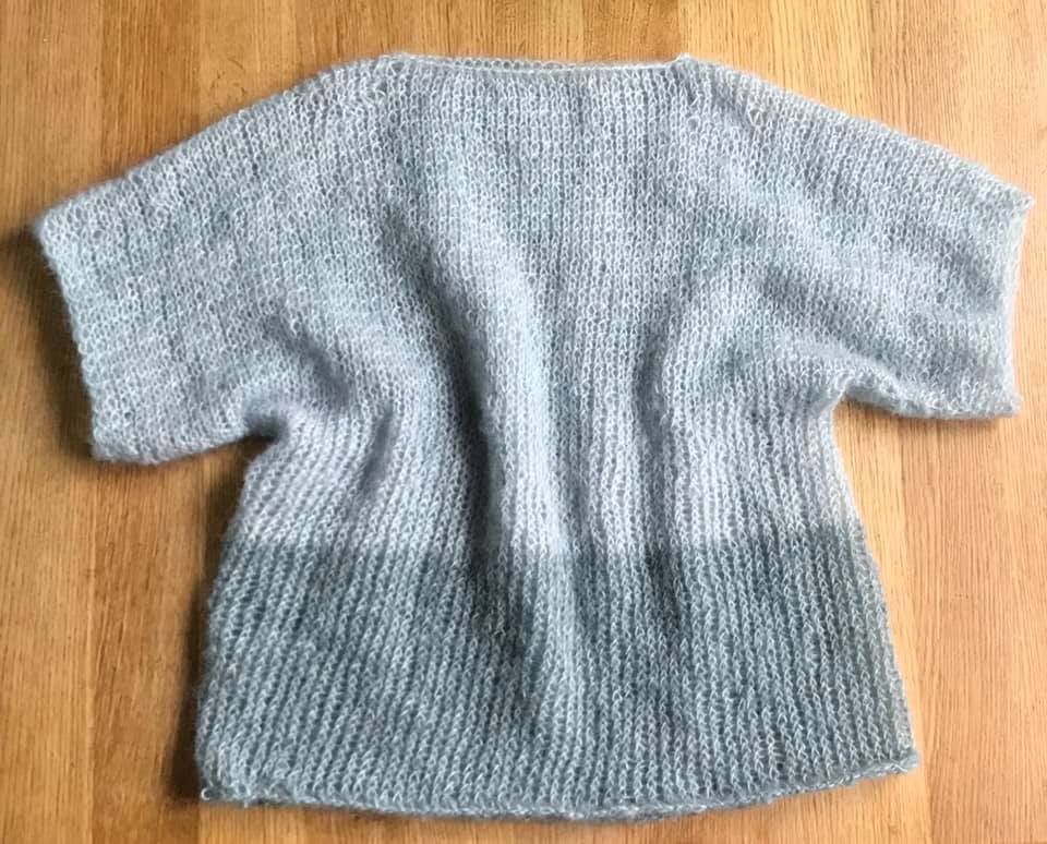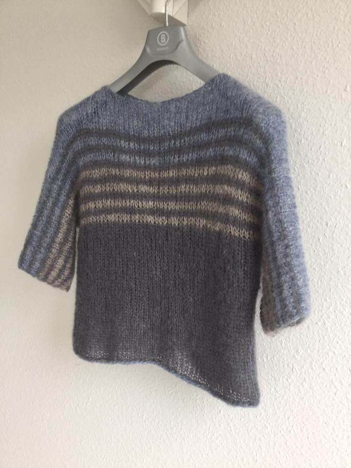 Gestrickt habe ich die Variante in XL, zweifädig mit der DROPS Kid-Silk in der Farbvariante „blauer Nebel“. Nadeln habe ich in NS 8 und statt der 5 in 6 gewählt (mit der NS 5 wurde der Abschluss etwas zu eng).