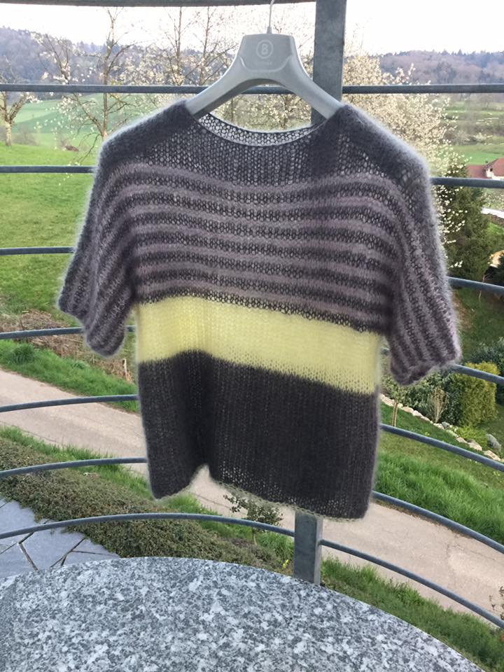Shirt 2: Größe M aus Mohair Luxe Lang Yarns in den Farben Grau(hell), Flieder und Zitronengelb.