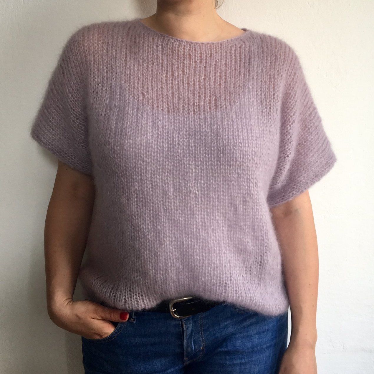 Mein Shirt ist gewaschen und getragen und für sehr gut befunden. Solange ich keinen passenden Gürtel habe, krempel ich es in die Hose, mag ich auch sehr gerne. Meine Details: Größe S, Länge 58cm. Wolle: Drops Kid Silk uni colour Nr. 4 medium pink. Lauflänge: 50g=210m , 2Fädig. Verbrauch 150g.
