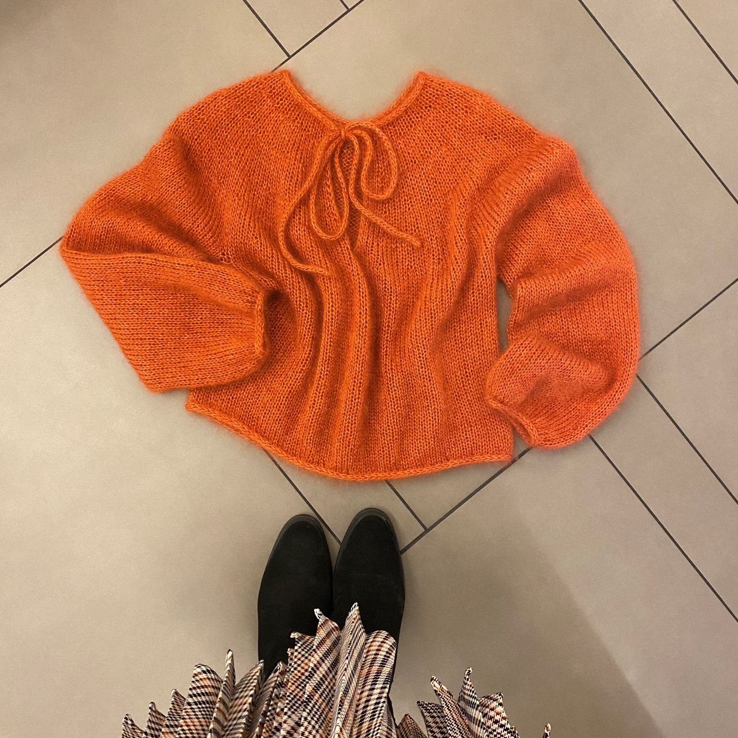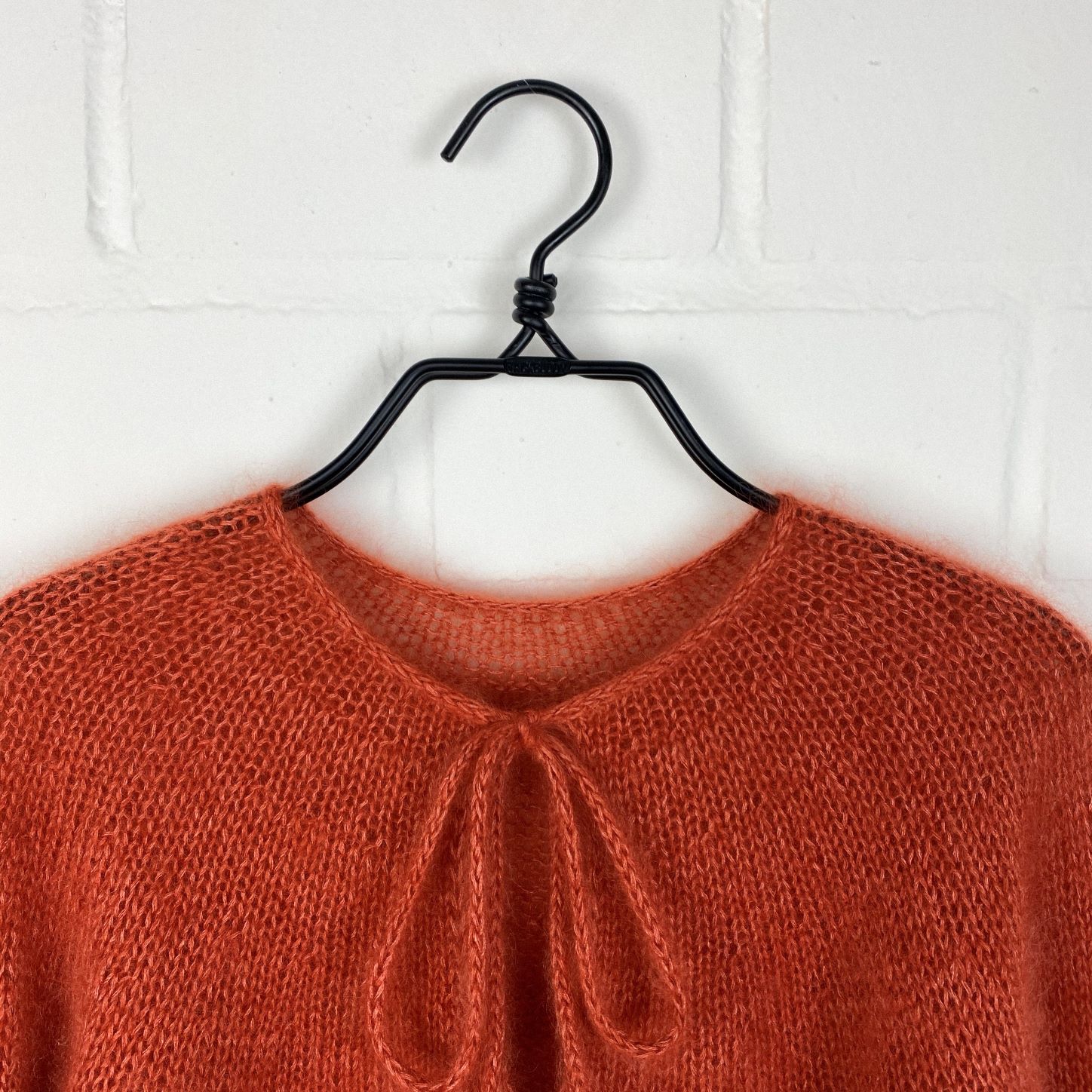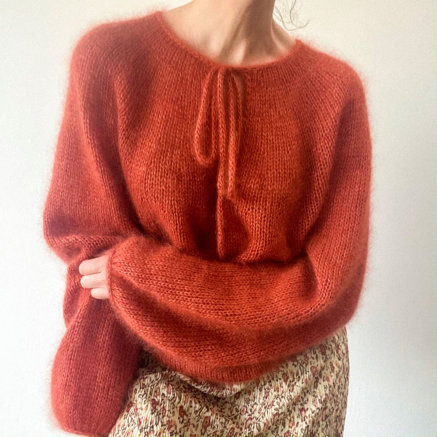 Strickanleitung Maya Bluse: Rundpassen-Pullover in Blusenform mit I-Cord-Schleife, tiefem Tröpfchenausschnitt und Ballonärmeln. Der Pullover kann auch mit dem Ausschnitt nach hinten getragen werden.