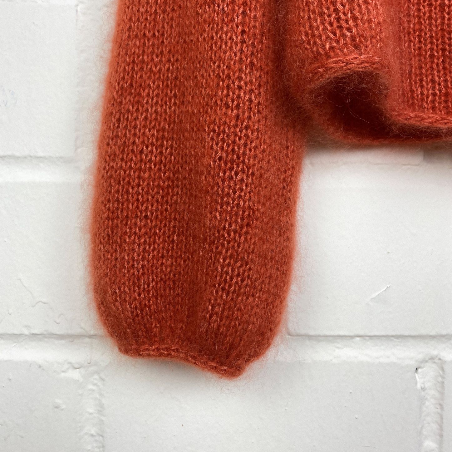 Der Saum und Ärmelsaum wird ebenfalls mit einem I-Cord-Kordel-Abschluss abgekettet. Durch die engen I-Cord-Abschlüsse fällt der Jumper an den Ärmeln und auf der Hüfte ballonartig.