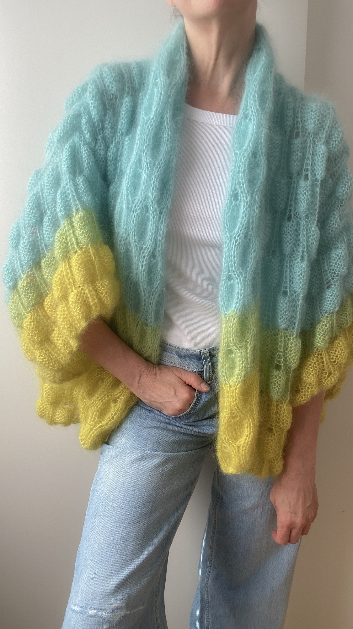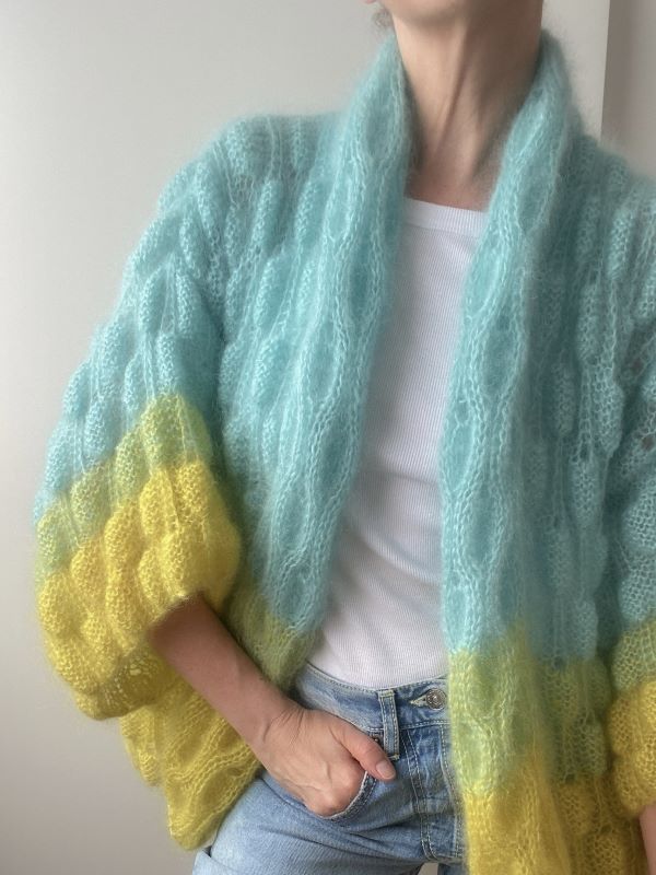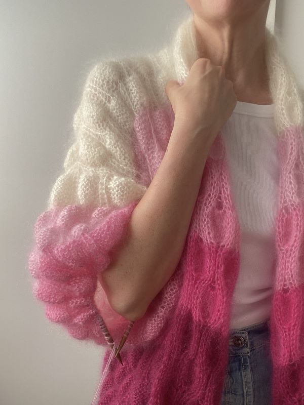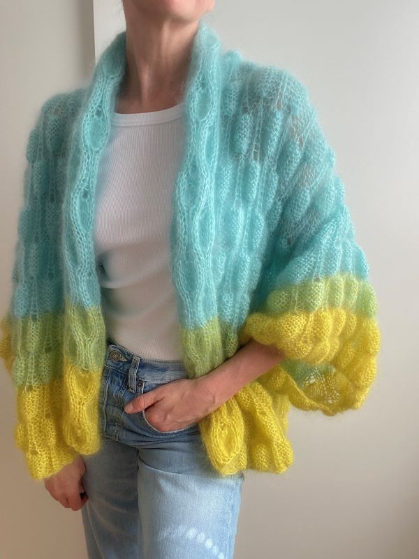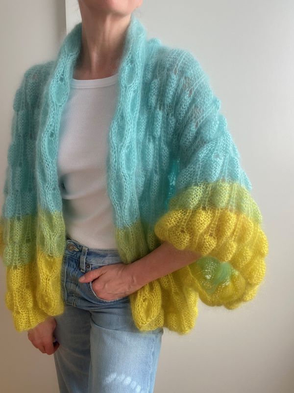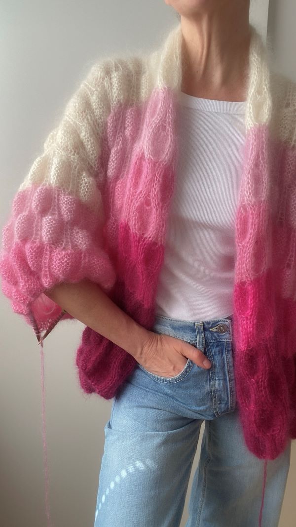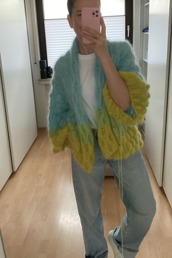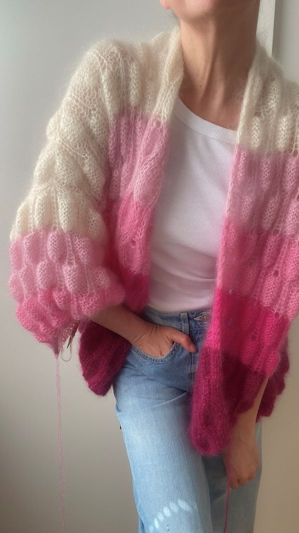 Der MALIA Cardigan ist ein Oversize Cardigan im trendigen Himbeermuster, Der Mint/Gelbe Cardigan hat einen kleinen Farbverlauf am Rumpf und Ärmel. Der gestreifte Cardigan wird in Offwhite und verschiedenen Beerentönen gestrickt.