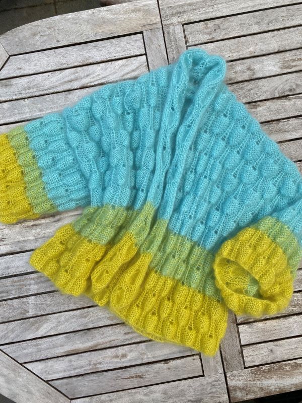Der Cardigan wird von oben Top-Down gestrickt und zunächst mit der rückwärtigen Blende begonnen. Die Blende kann in drei unterschiedlichen Breiten gestrickt werden, so dass wahlweise mit schmalem, mittlerem oder weitem Schalkragen gestrickt werden kann. Der mint/gelbe Cardigan mit Farbverlauf hat einen weiten Schalkragen. Der gestreifte MALIA Cardigan in Beerentönen hat einen mittleren Schalkragen (siehe Fotogalerie).