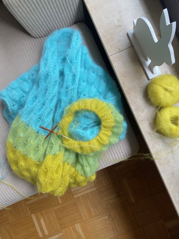 2 Fäden „Mohair Luxe” (175m/25g) in Mint 058 und Gelb 114 von Lang Yarns