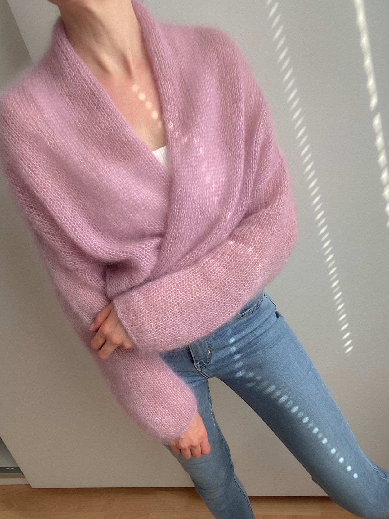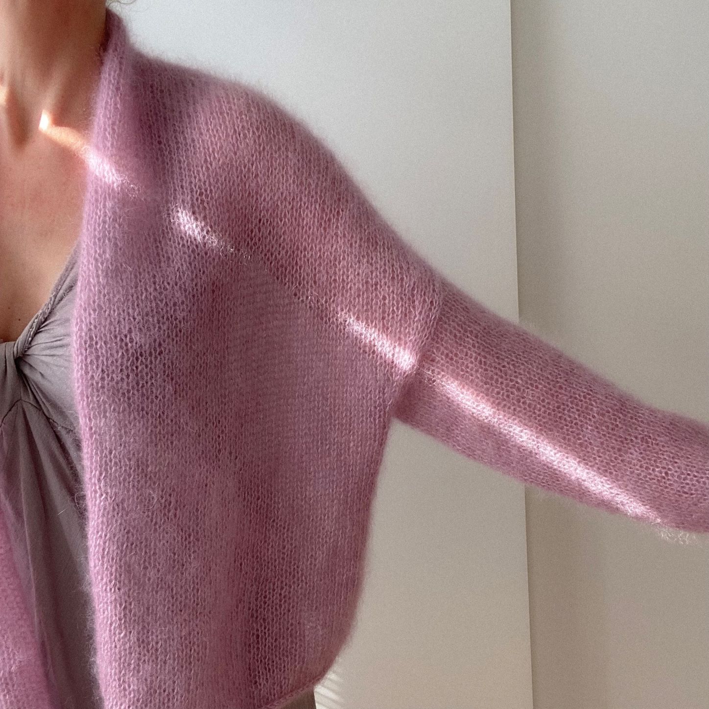 Der MARTA Summer Cardigan ist eine luftig leichte Mohair Strickjacke mit kleinem Schalkragen und schmalen Ärmeln. Wahlweise können 2 verschiedene Saum- und Ärmelabschlüsse gearbeitet werden (Glattpatent oder I-Cord).